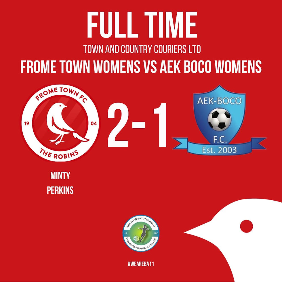 Frome Town Women made a massive statement in their League campaign with an assured 2-1 win at Badger’s Hill today over current Divisional leaders, AEK Boco. In front of a record crowd of 145, and under a black sky, Frome took to the pitch looking to remove the threat they knew would come from Boco’s front three as the away side set out to do just that, starting quickly to close Frome down and then looking to release pace on their right wing. Frome’s backline of Edwards, Perkins and Didymus were pressed hard but soaked up the pressure, with support from Starr, Bristow, Wyatt and Minty.